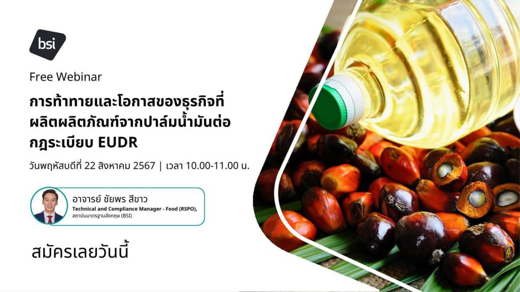 พบกับฟรีสัมมนาออนไลน์ ของ BSI Thailand “การท้าทายและโอกาสของธุรกิจที่ผลิตผลิตภัณฑ์จากปาล์มน้ำมันต่อกฎระเบียบ EUDR”