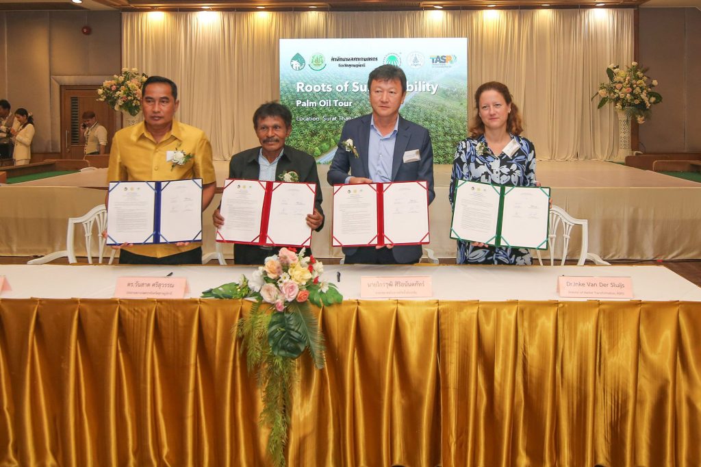 เพื่อยกระดับมาตรฐานการผลิตปาล์มน้ำมันอย่างยั่งยืนตามมาตรฐานสากล สมาคมโรงสกัดน้ำมันปาล์ม สภาเกษตรกรจังหวัดสุราษฎร์ธานี สมาคมชาวสวนปาล์มจังหวัดสุราษฎร์ธานี และองค์กรเจรจาระหว่างประเทศว่าด้วยปาล์มน้ำมันยั่งยืน (RSPO) ร่วมลงนาม MOU สนับสนุนการรวมกลุ่มและพัฒนาศักยภาพของเกษตรกรผู้ปลูกปาล์มน้ำมันประเทศไทย สู่การรับรองกระบวนการผลิตปาล์มน้ำมันยั่งยืนตามมาตรฐานโลก RSPO โดยมีรองผู้ว่าราชการจังหวัดสุราษฎร์ธานีพร้อมผู้นำอุตสาหกรรมปาล์มน้ำมันทั้งไทยและต่างประเทศ ร่วมเป็นสักขีพยาน ที่ สุราษฎร์ธานี เมืองปาล์มน้ำมันยั่งยืนต้นแบบของประเทศไทย