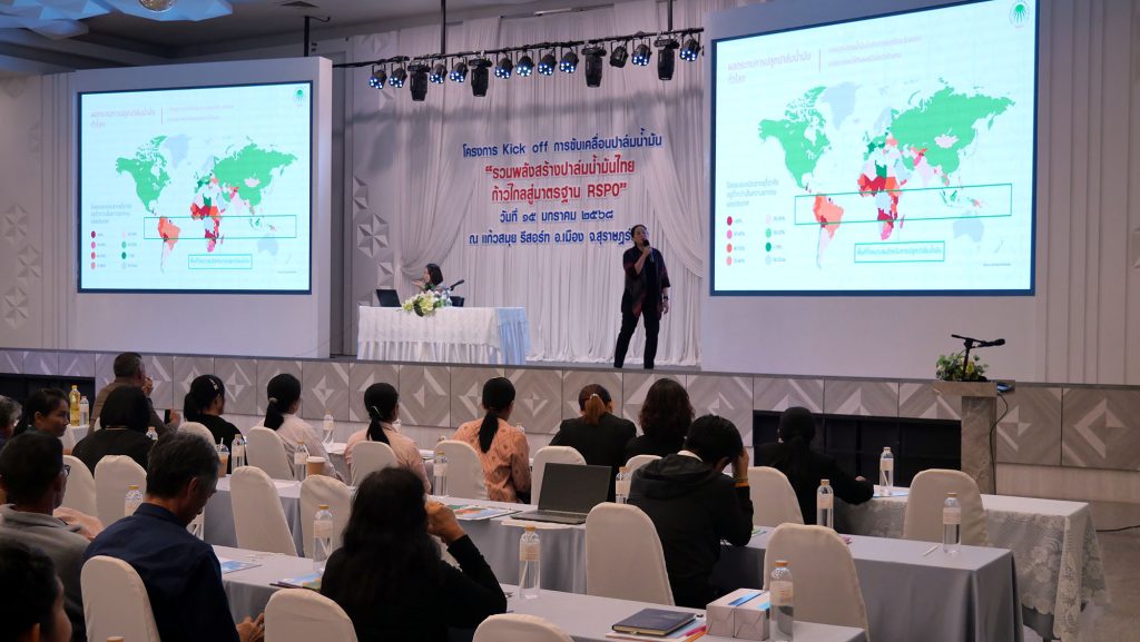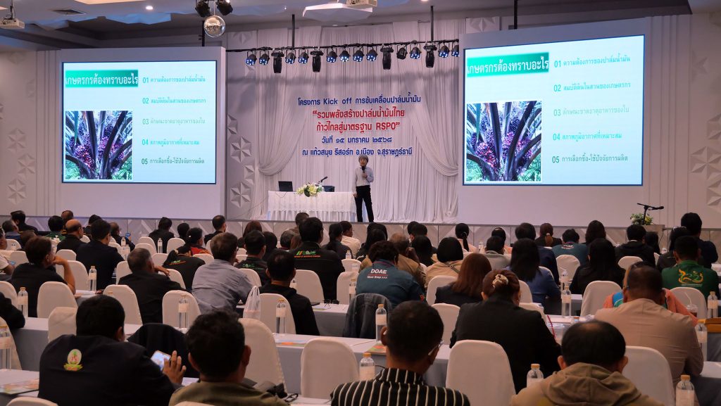 วันที่ 15 มกราคม 2568 นายวีรศักดิ์ บุญเชิญ รองอธิบดีกรมส่งเสริมการเกษตร พร้อมด้วยนายวุฒิชัย ชิณวงศ์ ผู้อำนวยการสำนักส่งเสริมและจัดการสินค้าเกษตร เข้าร่วม งาน Kick off การขับเคลื่อนปาล์มน้ำมัน “รวมพลังสร้างปาล์มน้ำมันไทย ก้าวไกลสู่มาตรฐาน RSPO” โดยมี นายบุญสิงห์ วรินทร์รักษ์ ที่ปรึกษารัฐมนตรีว่าการกระทรวงเกษตรและสหกรณ์ เป็นประธานในพิธีเปิด Kick off ฯ พร้อมมอบนโยบายการขับเคลื่อนปาล์มน้ำมันของไทย เป็นแนวทางในการขับเคลื่อนสินค้าเกษตรมูลค่าสูง ส่งเสริมการผลิตที่มีมาตรฐาน สามารถแข่งขันได้ในตลาดโลก สอดคล้องกับนโยบาย ตลาดนำ นวัตกรรมเสริม เพิ่มรายได้ มีวัตถุประสงค์เพื่อสร้างการรับรู้ ความรู้ ความเข้าใจและเตรียมความพร้อมสู่การใช้มาตรฐาน RSPO ฉบับใหม่ ปี ๒๕๖๗ และ Prisma : ระบบการรับรอง การค้า และตรวจสอบย้อนกลับ การจัดการสวนปาล์มน้ำมันอย่างยั่งยืนและจัดการสวนปาล์มน้ำมันที่เป็นเลิศ และเพื่อสร้างเครือข่ายการขับเคลื่อนปาล์มน้ำมัน ระหว่างภาครัฐ ภาคเอกชน และเกษตรกร ให้ก้าวไกลไปในตลาดโลกอย่างมั่นคงและยั่งยืน โดยมีเจ้าหน้าที่ เกษตรกรที่ได้รับการรับรองมาตรฐาน RSPO และเกษตรกรผู้ปลูกปาล์มน้ำมัน องค์กรเจรจาระหว่างประเทศ ว่าด้วยปาล์มน้ำมันยั่งยืน RSPO และบริษัทเอกชน เข้าร่วมงาน จำนวนทั้งสิ้น 250 ราย