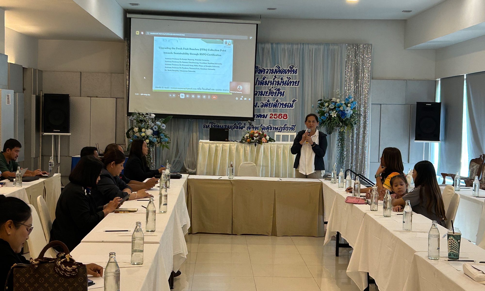 ผศ.ดร.สมใจ หนูผึ้ง อาจารย์จากสำนักวิชาการบัญชีและการเงิน มหาวิทยาลัยวลัยลักษณ์ หัวหน้าโครงการวิจัย ได้นำเสนอวัตถุประสงค์ กรอบการวิจัย ผลการศึกษาเบื้องต้น และข้อเสนอแนะเชิงปฏิบัติ ซึ่งผลการศึกษาแสดงให้เห็นว่าลานเทปาล์มน้ำมันมีบทบาทสำคัญอย่างยิ่งในการเป็นตัวกลางเชื่อมโยงระหว่างเกษตรกรรายย่อยและโรงสกัดปาล์มน้ำมัน แต่ลานเทปาล์มน้ำส่วนใหญ่ยังไม่ได้รับการรับรองมาตรฐานปาล์มน้ำมันยั่งยืนของ RSPO ซึ่งส่งผลกระทบต่อปริมาณปาล์มน้ำมันยั่งยืนตลอดห่วงโซ่อุปทาน รวมถึงความสามารถในการตรวจสอบย้อนกลับ (Traceability) และคุณภาพของปาล์มน้ำมัน นอกจากนี้ งานวิจัยยังได้มีการวิเคราะห์เชิงพื้นที่ชี้ให้เห็นรูปแบบการรวมกลุ่มของลานเทปาล์มน้ำมันที่มีศักยภาพในการรวบรวมผลผลิตปาล์มน้ำมันในพื้นที่ ซึ่งสะท้อนโอกาสในการพัฒนากลยุทธ์ในการยกระดับลานเทปาล์มน้ำมันของไทยให้ได้รับมาตรฐานปาล์มน้ำมันยั่งยืน