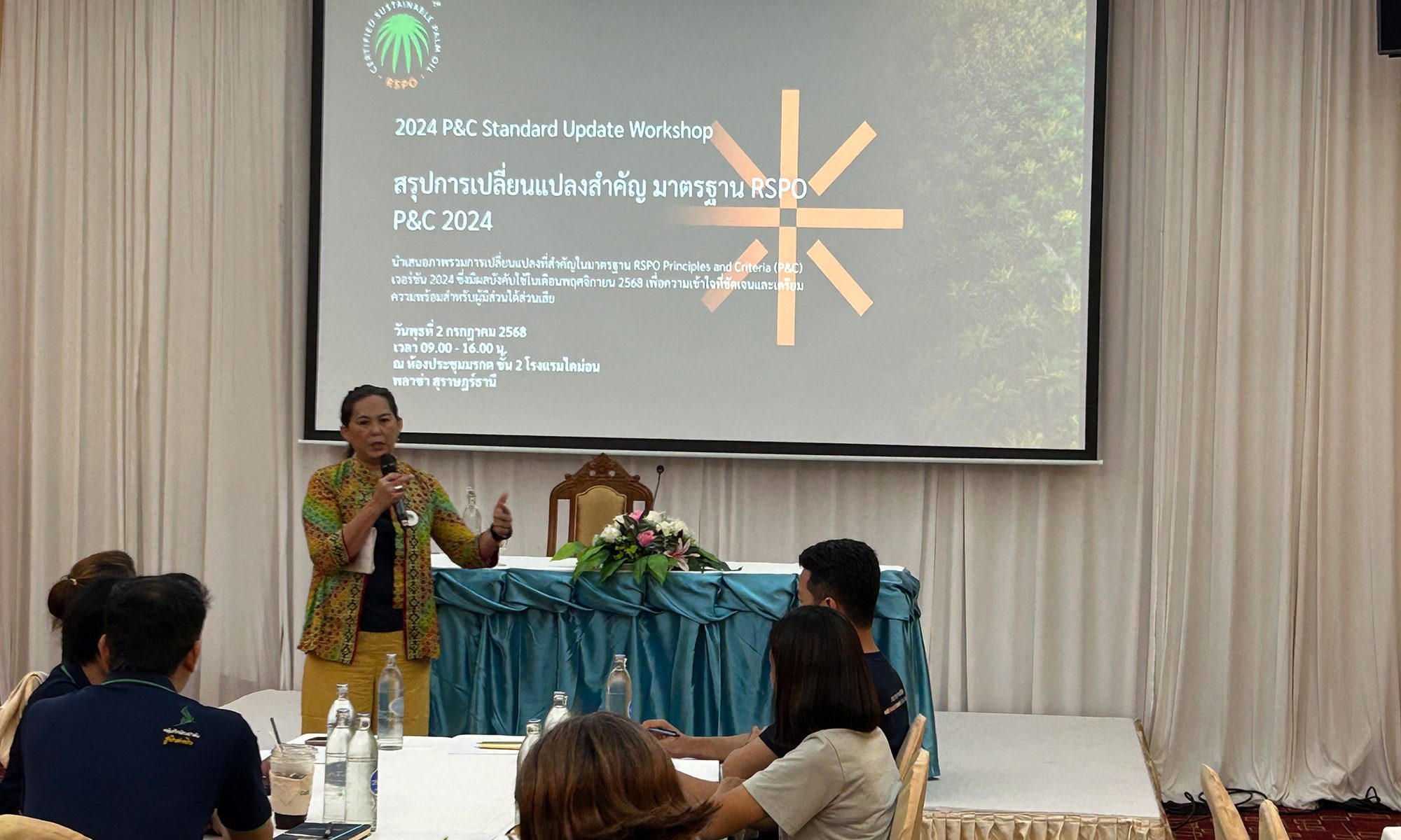 SURAT THANI, Thailand – 2 July 2025 – RSPO Thailand successfully held a workshop titled “2024 P&C Standard Update Workshop” at the Busarakam Meeting Room, Diamond Plaza Hotel. The primary objective of this event was to cultivate understanding and readiness among medium and large-scale palm oil growers regarding the forthcoming 2024 Principles and Criteria (P&C) Standard. The aim is to enable these growers to effectively implement the updated standard for sustainable palm oil cultivation in accordance with RSPO guidelines. Furthermore, the workshop served as a crucial forum for exchanging experiences and feedback on the new standard, establishing a vital foundation for the subsequent National Interpretation (NI) process. The assembly included representatives from prominent medium and large-scale palm oil growing organisations across Thailand.